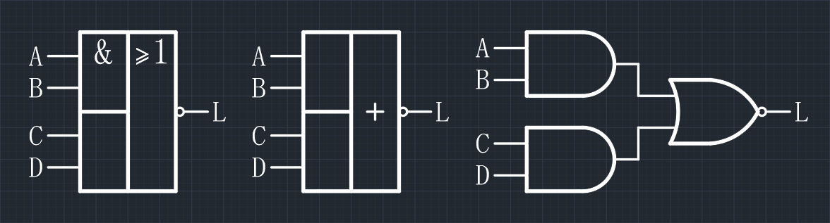 - 逻辑表达式:$L = \overline{AB + CD}$