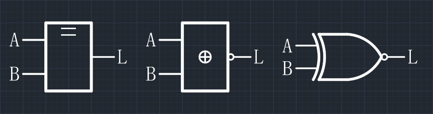 - 逻辑表达式:$L = A \odot B = \overline{A \oplus B} = AB + \overline{A} \overline{B}$(这里将原式展开,然后运算化简即可得最终式子)