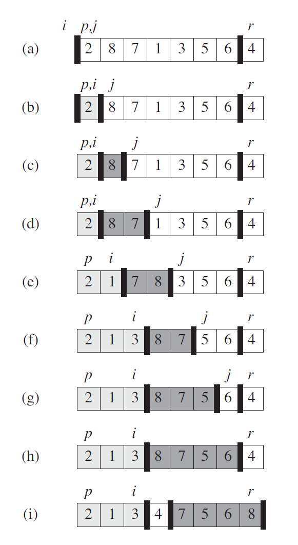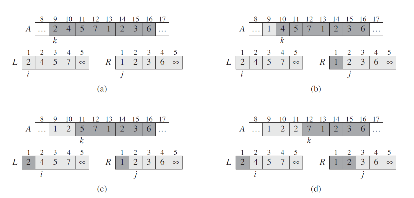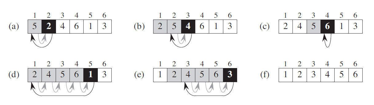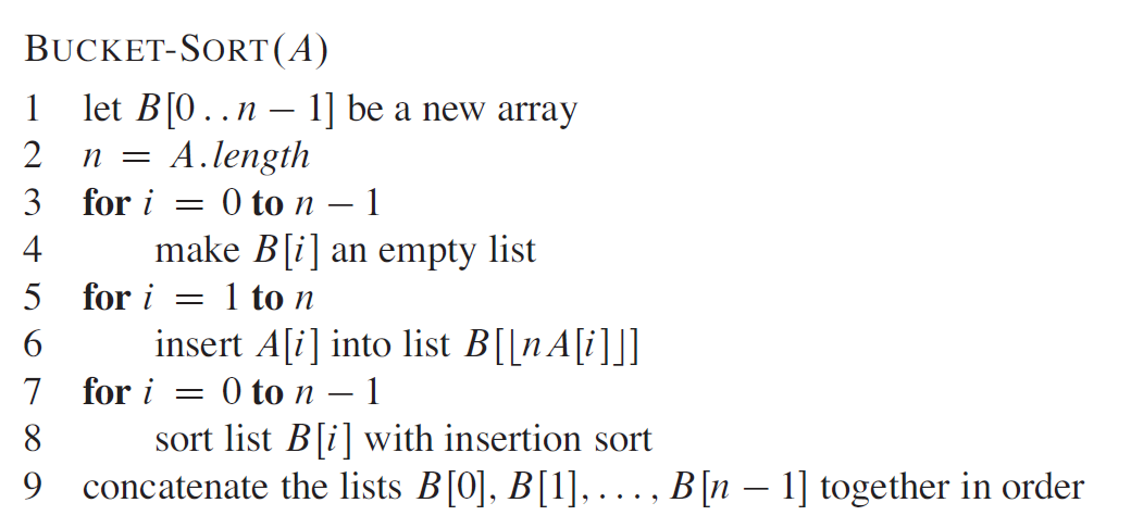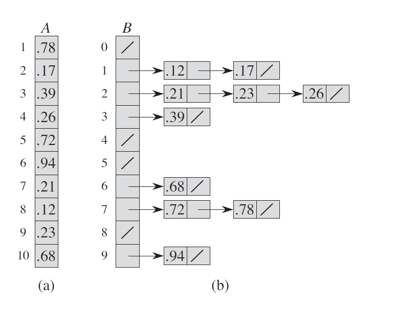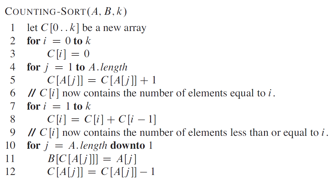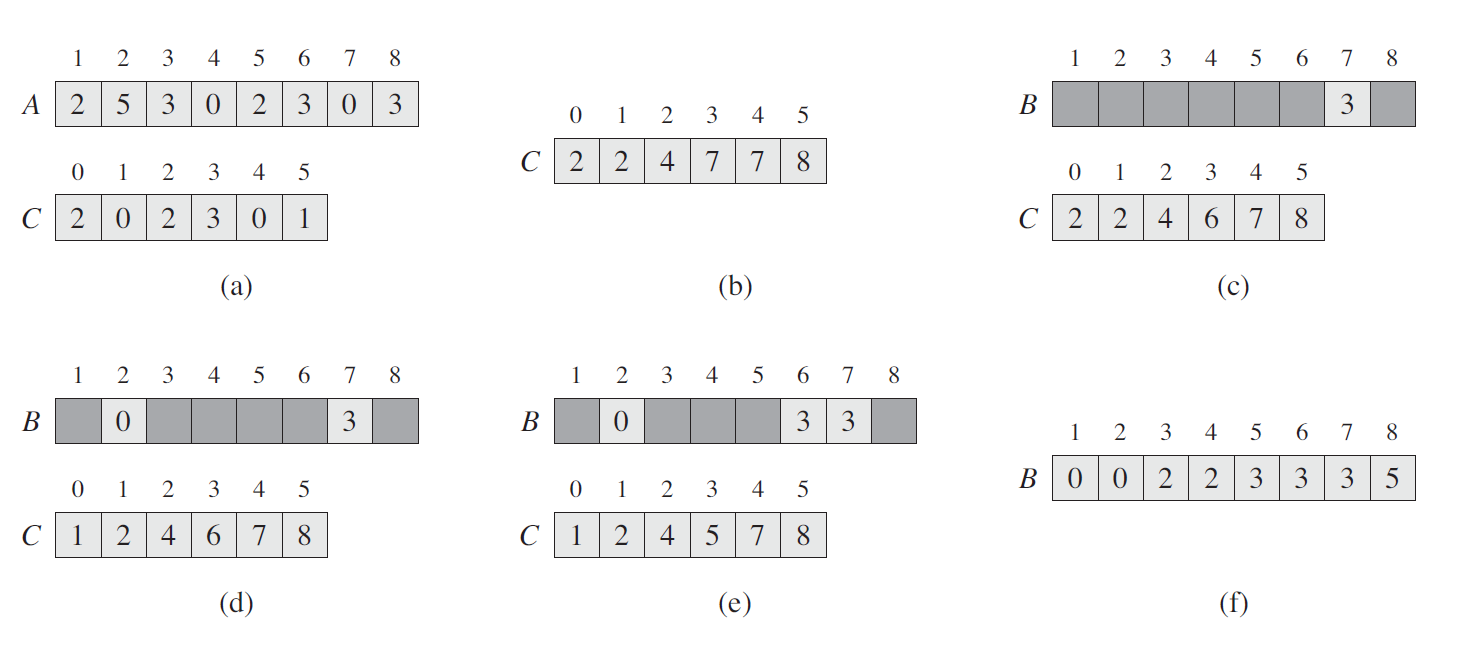 上图是 COUNTING-SORT 在输入数组 A[1..8] 上的处理过程,其中 A 中的每一个元素都是不大于 k = 5 的非负整数。(a) 是第 5 行执行后的数组 A 和辅助数组 C 的情况。(b) 是第 8 行执行后,数组 C 的情况。(c)(e) 分别显示了第 1012 行的循环体迭代了一次、两次和三次之后,输出数组 B 和辅助数组 C 的情况。其中,数组 B 中只有浅色阴影部分有元素值填充。(f) 是最终排好序的数组 B。