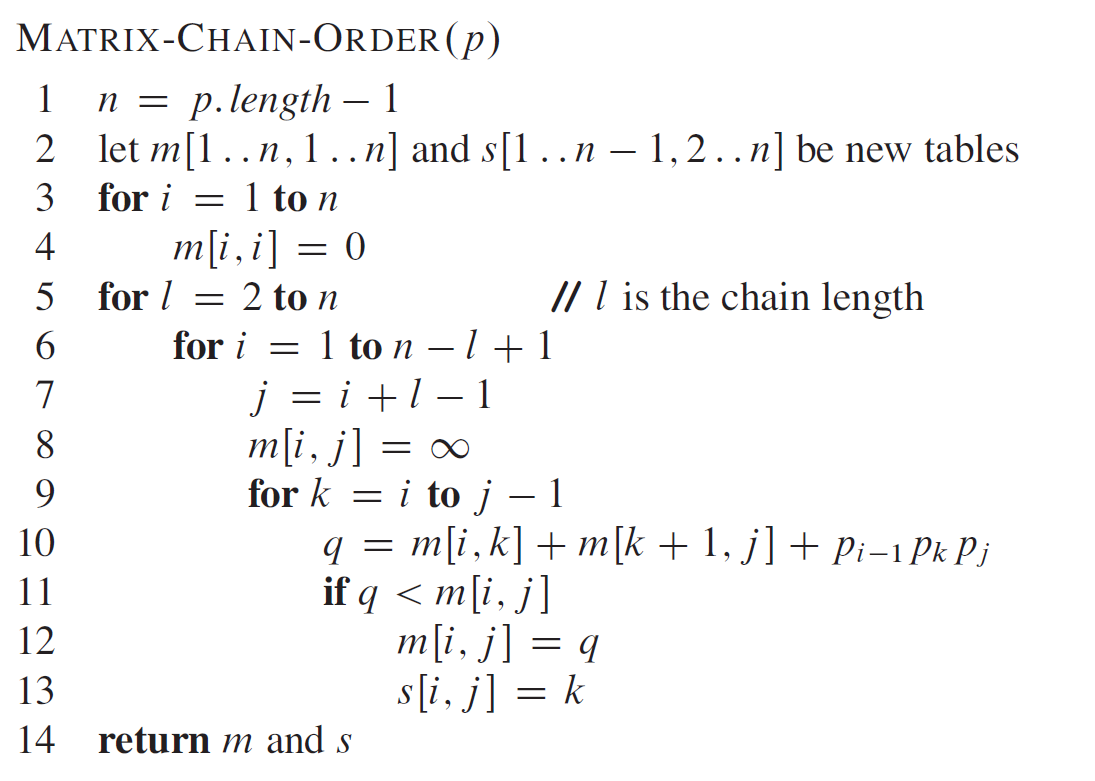 m[i][j]:对应书中的m[i + 1, j + 1],表示计算矩阵$A_{i + 1..j + 1}$所需标量乘法次数的最小值。关于定义,书中是m[1..n, 1..n],而代码中是m[0..n - 1][0..n - 1]。s[i][j]:对应书中的s[i + 1, j + 2],表示最优值m[i + 1][j + 2]对应的分割点 k。关于定义,书中是s[1..n - 1, 2..n],而代码中是s[0..n - 1][0..n - 1],因此,这也导致了在代码中,与m[i][j]对应的最优分割点是s[i][j - 1]。