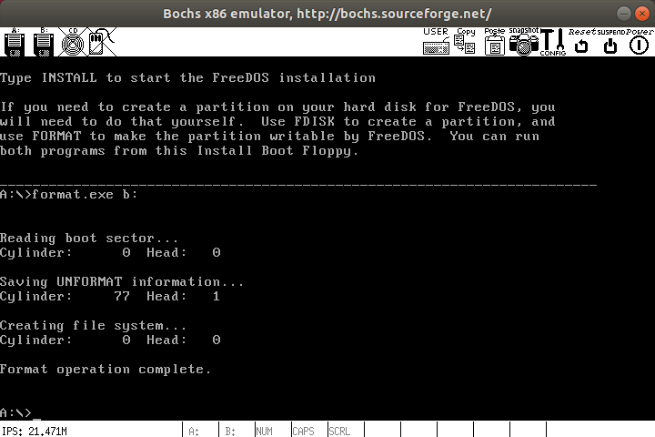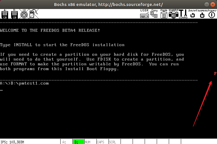 5、启动 Bochs,待 FreeDos 启动完毕后格式化 B: 盘,如下图所示