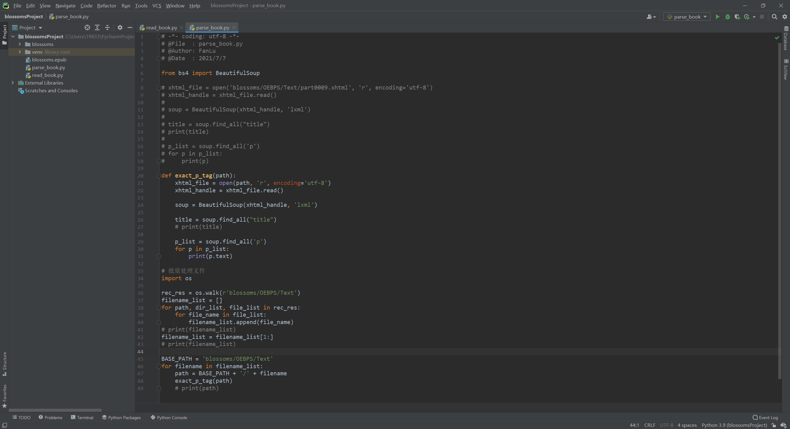 我把原 epub 文件解压后的文件夹 blossoms 放在项目的根目录下